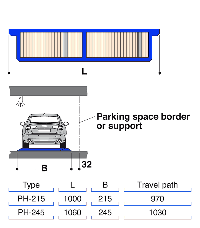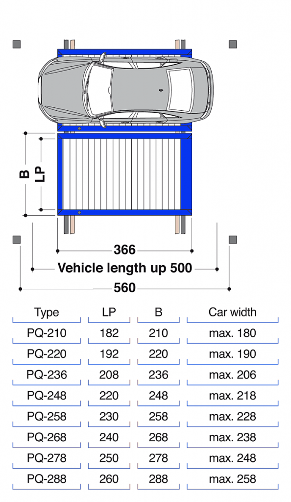 lengths max. 500 cm, heights 10 cm lower than headroom - Standard design: 2.000 kg per parking space, optional 2.300 kg