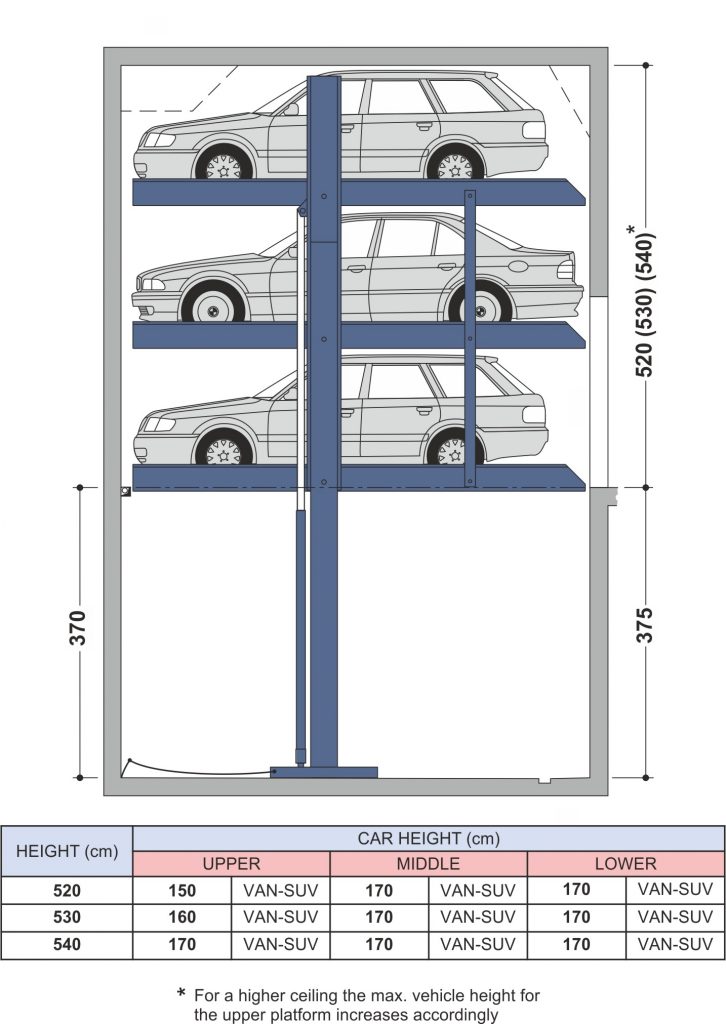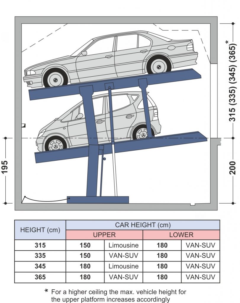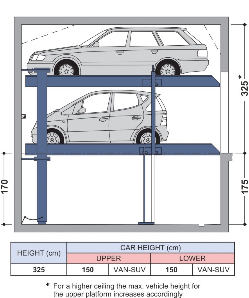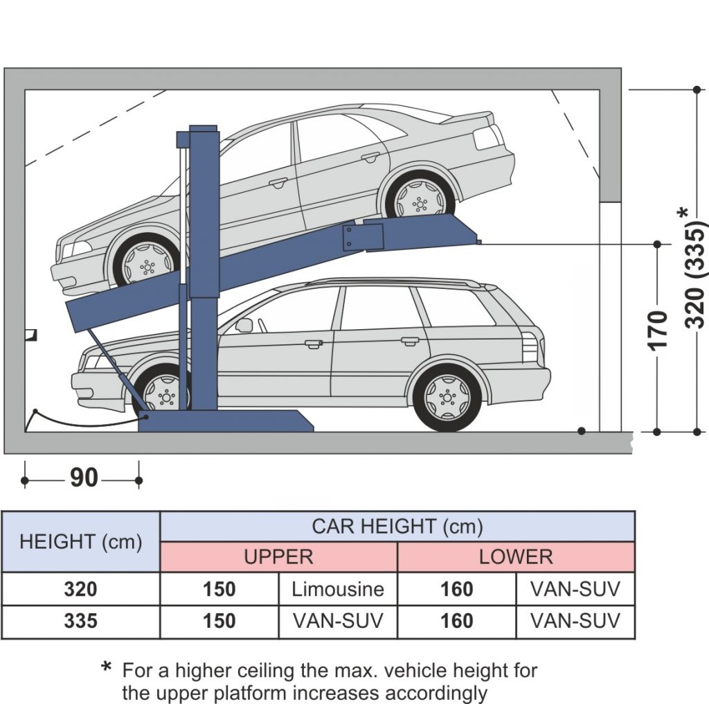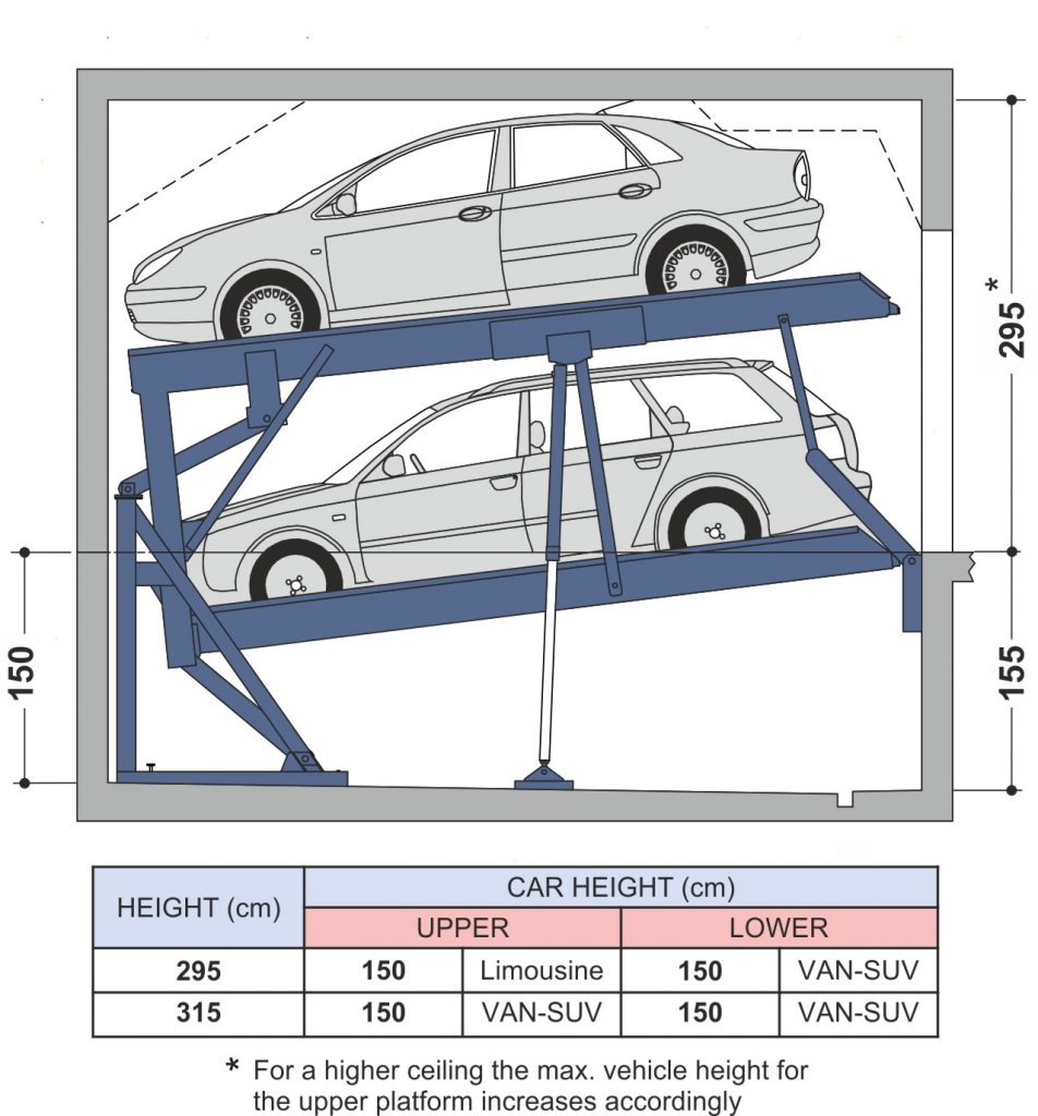 - Vehicle heights up to 150 cm (with more ceiling height, correspondingly higher vehicles can be parked at the top)